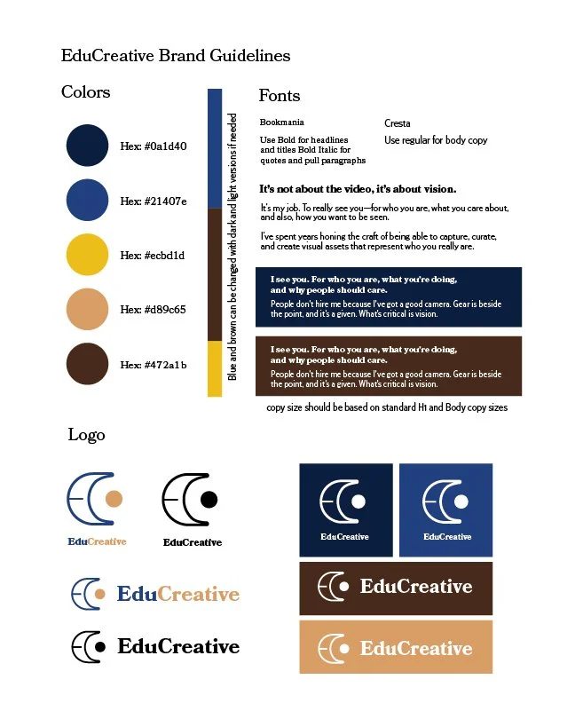 EduCreative is a brand identity project for a videography company specializing in education and private schools. The goal was to create a visual system that balances creativity with credibility, informed by research into educational values, trust, and storytelling. Every design decision was made intentionally, using structure and symbolism to communicate clarity, professionalism, and approachability.